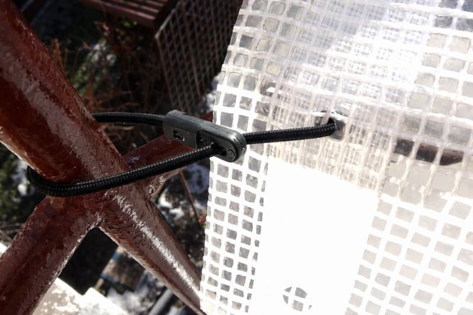 Produkt wyposażony jest w plastikowe zakończenia – z jednej strony końcówkę przebijającą, która pozwala na szybkie przełożenie gumy przez materiał, z drugiej strony końcówkę typu hak, umożliwiającą stabilne zaczepienie o konstrukcję, rusztowanie lub inny element nośny.